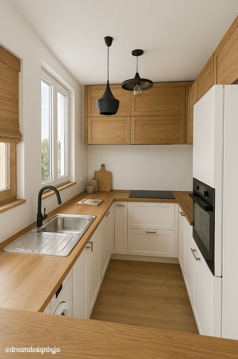 Conception d’une cuisine compacte selon les souhaits du client: privilégier le blanc pour les façades et un plan de travail en bois. L’agencement intègre un réfrigérateur, une machine à laver ainsi que l’ensemble des équipements pour une cuisine fonctionnelles et esthétiques.